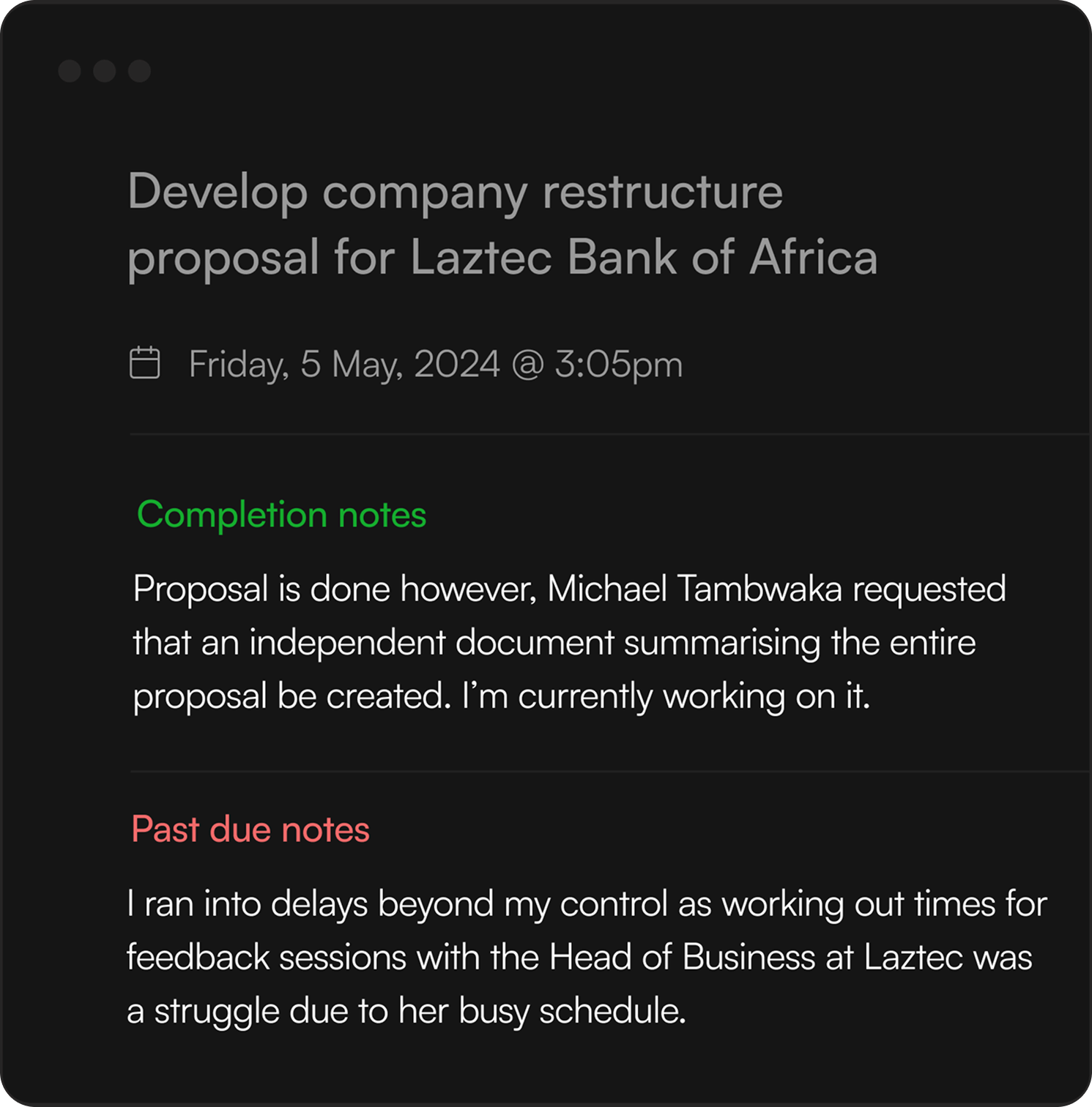 Attach notes to completed tasks, giving your team clarity on updates, challenges, and more.